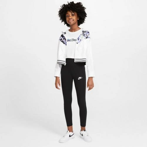 Nike Girls’ Sportswear High Waisted Leggings offer the ultimate blend of soft, stretchy comfort and snug support. The high waist makes it easy to pair these leggings with her favourite crop tops.