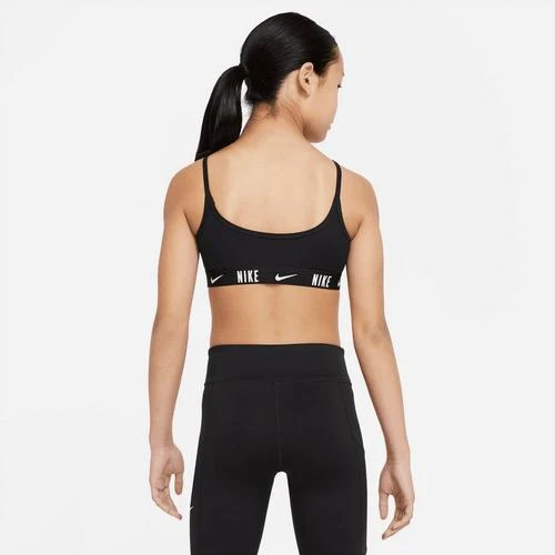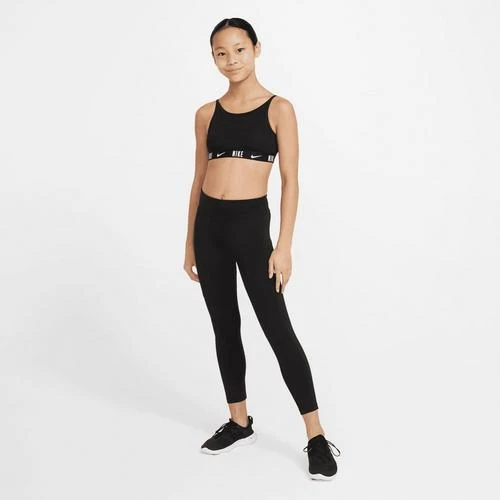 The Nike Trophy Big Kids’ Sports Bra provides light support and full coverage with a high-chest design and stretchy fabric that fits snugly and securely.